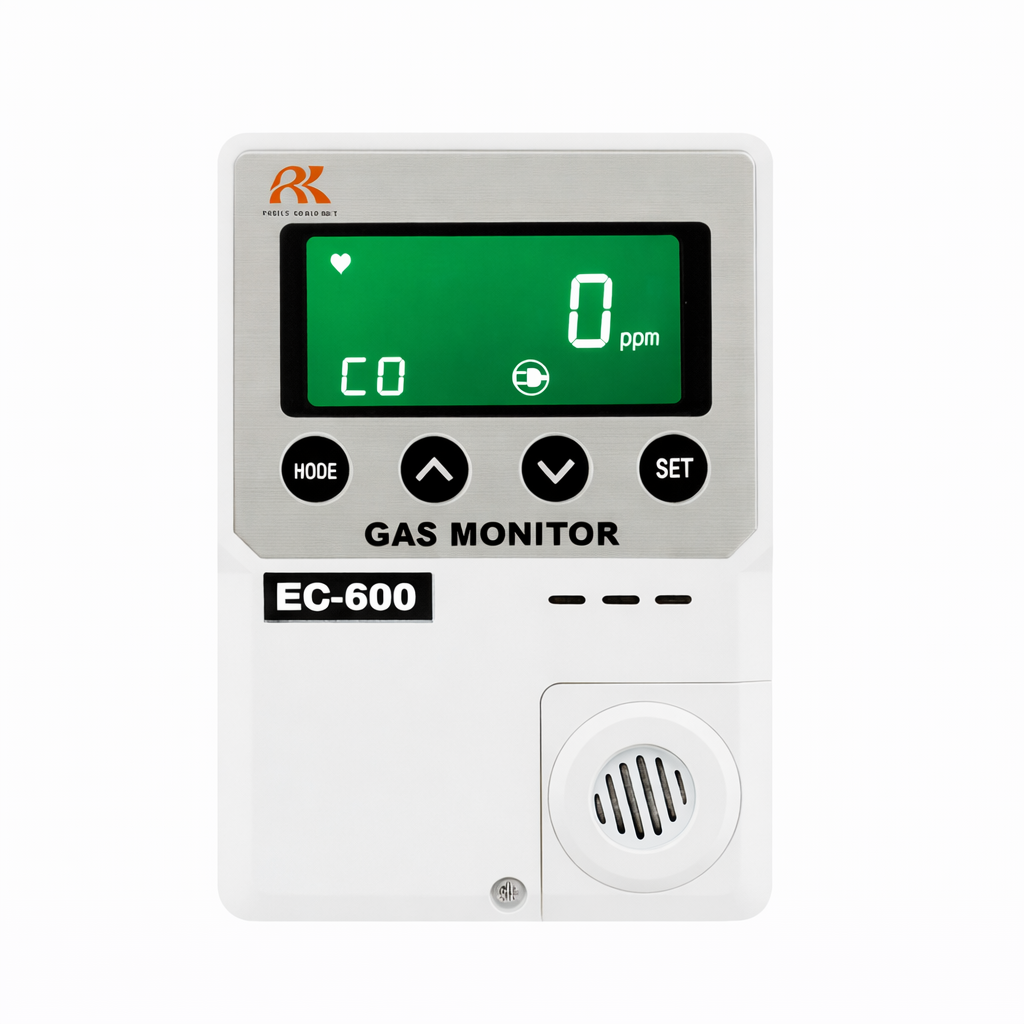Monitor de monóxido de carbono para interiores, con display tricolor que cambia según el nivel de alarma. Funciona con AC, DC o baterías, incorpora sensor electroquímico reemplazable y ofrece alarmas audibles y visuales en un diseño compacto de montaje en pared.